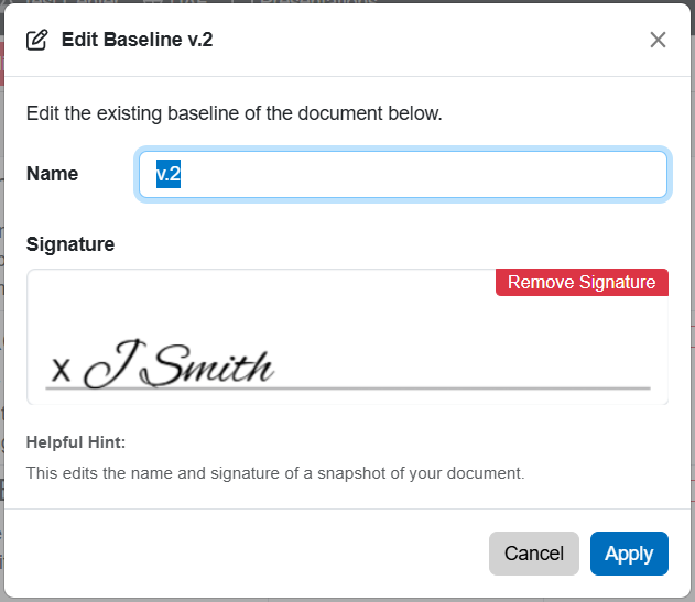 Once inside the modal, you can update the baseline details such as name and signature to ensure they accurately reflect the document’s state or changes made during the project. After making the necessary updates, click Apply to finalize the modifications. Editing baselines enables users to align their documentation with project progress and organizational requirements while maintaining a clear record for tracking historical changes.