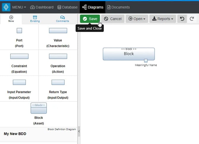 - Within a ‘Block Definition Diagram,’ click the ‘Block (Asset)’ icon in the ‘New’ tab of the left sidebar and continue to hold down the left mouse button.