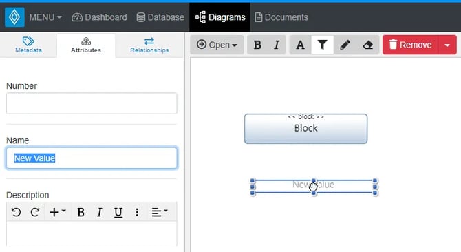 - Once added to the diagram, enter a meaningful ‘Name’ for your new ‘Block’ via the ‘Attributes’ tab of the left sidebar (focused automatically for convenience).