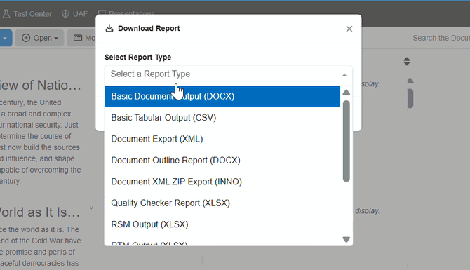 Please keep in mind that the reporting from this view is limited to the entities included in the corresponding document's view. Documents View only show the Statement class and subclasses of Statement, like Requirement. If you need to generate a report on additional entity classes not included in the document, please use the Reports out of Database View or Compilations View.