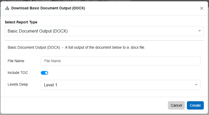 The Document Outline Report generates the entire hierarchy of the document outline. Only the number and name are extracted in DOCX format. Upon selecting the Document Outline Report option the pop up will change to give this file a name. Select 'Create' to generate the report.