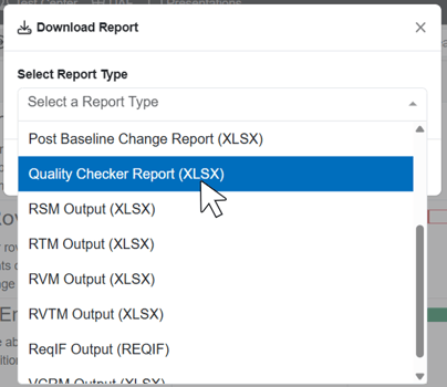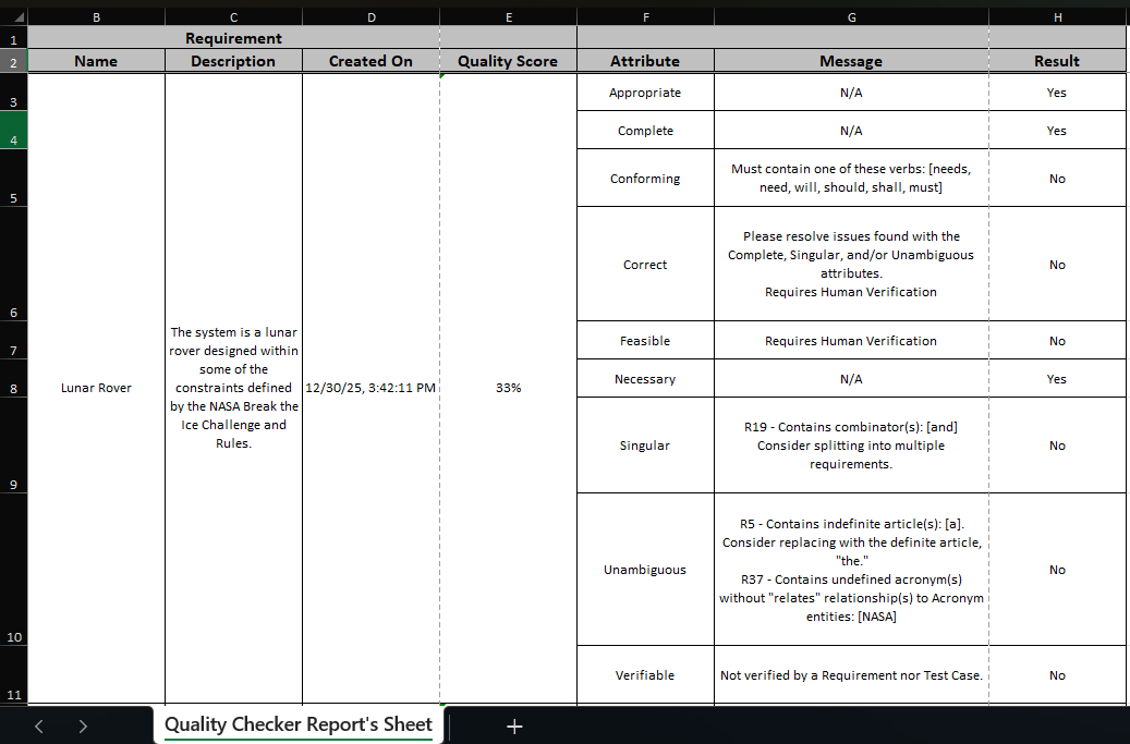 The Quality Checker Report is an output of your most recent Quality Check results as a row-by-row breakdown of the results by requirement followed by the attribute results.