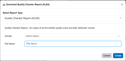After selecting the 'Quality Checker Report', a pop-up will appear where users can include Created By, Created On, Entity URL, Global ID, Labels, Modified On, Modified By data. Provide a 'File Name' and generate the report with the 'Create' button.