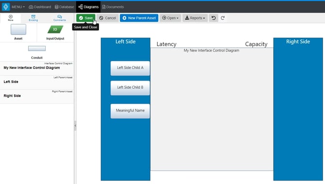 An Existing Parent ‘Asset’ construct can be added to an ‘Interface Control Diagram’ via the left sidebar. |