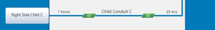 In the diagram, this root construct is represented as a gray box and the child conduit is represented as a solid blue line and a line label containing the name of the Conduit. The line can then be connected to child or parent ‘Asset’ constructs. The Latency and Capacity number attributes are also shown on the line. Latency is on the left and Capacity is on the right.