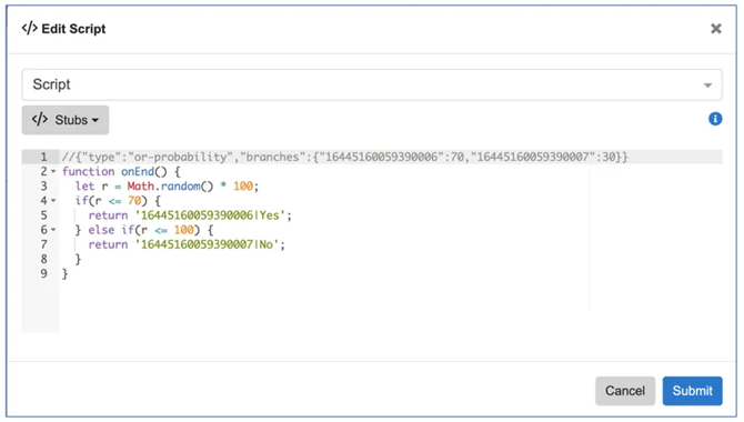 The OR and LOOP decision points (special cases of the Action) already come with pre-built scripts (Probability and Resource for both and Iterations for the Loop). These can be used without any scripting on your part. Just select the script type you want, adjust the values, and submit the script, then we generate the script automatically. The code behind each decision point’s script type can be accessed by selecting ‘Script’ from the drop-down menu. An example of each is shown in the later sections below.