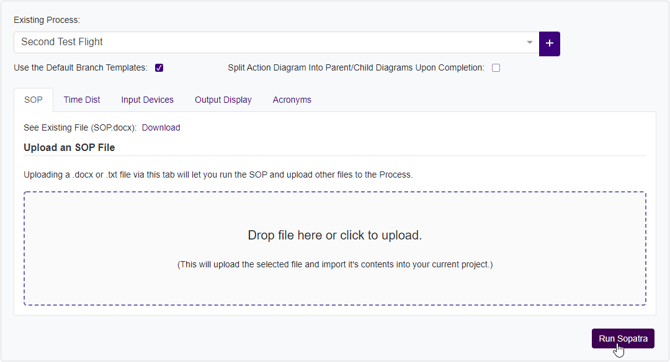 Once all the SOP files and any of the optional files have been uploaded to run Sopatra click the purple ‘Run Sopatra’ button. This will generate the process in the form of an Action Diagram and navigate to Diagrams View.