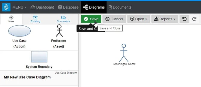 * Note: The above process describes using the ‘New’ tab of the left sidebar, which automatically generates a new entity to represent each new diagram construct. If you would like to reuse existing entities from your database to represent a new construct, use the ‘Existing’ tab instead.